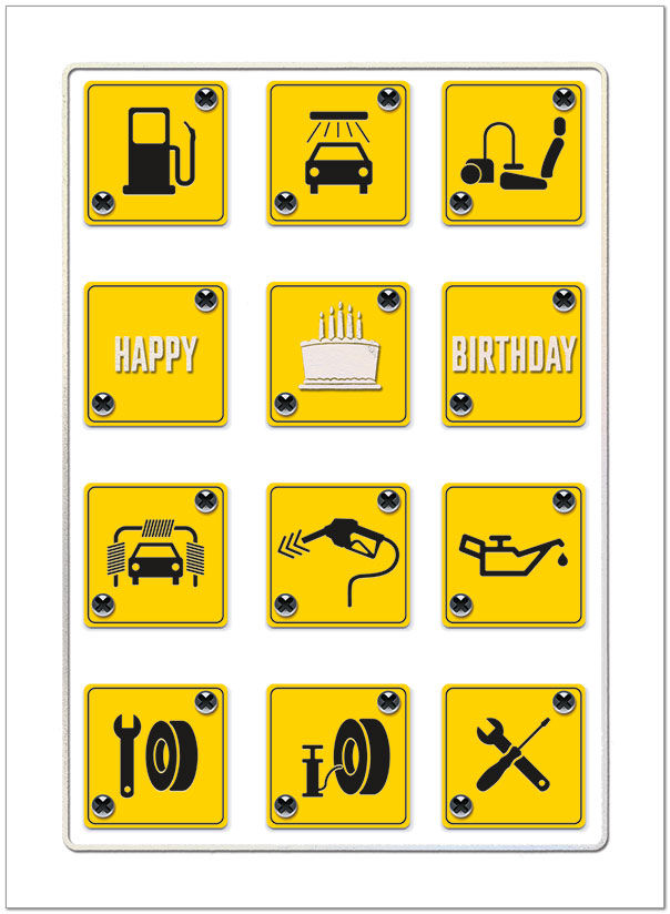 A clever birthday card with automotive signs featuring silver holographic foil stamping. Printed on satin FSC® paper.