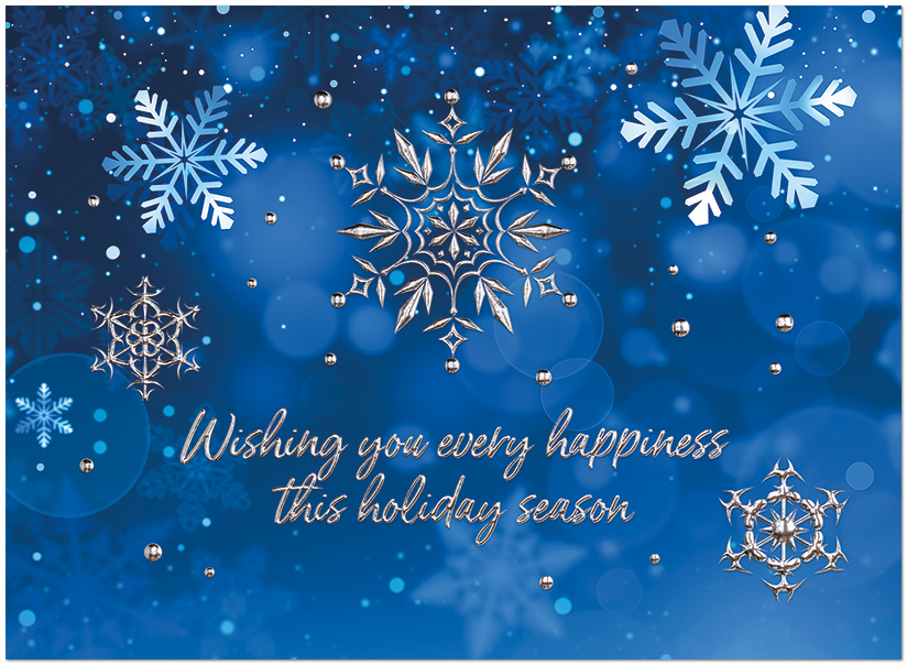A classic business holiday card featuring snowfalkes and silver foil embossing. Printed on satin FSC® paper.