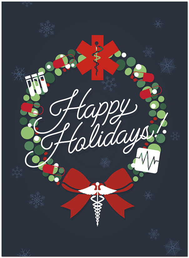 A medical-theme holiday card with a snowflake background and a festive medical wreath. Printed on satin FSC® paper.