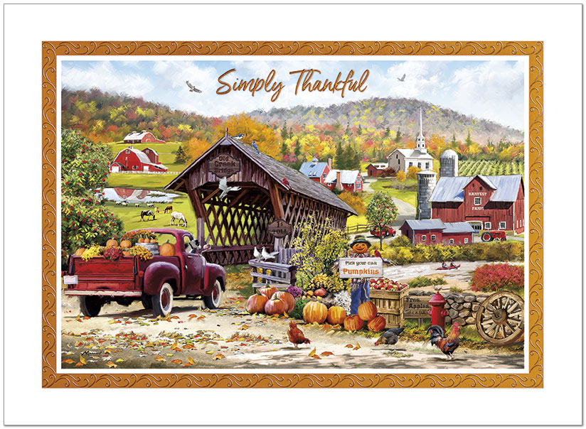 Send wishes for a bountiful holiday season with this idyllic autumn scene featuring copper foil embossing. Printed on matte FSC® paper.