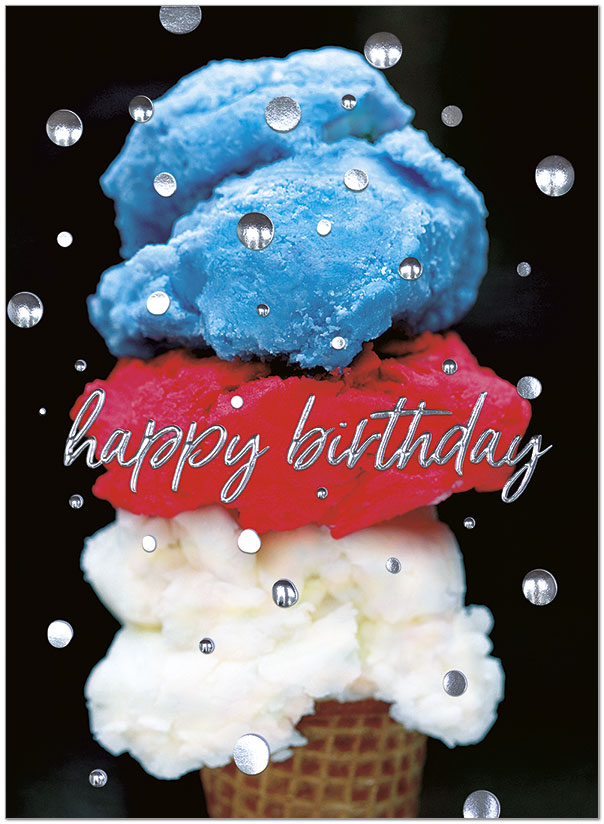 This birthday card features red, white, and blue ice cream with silver foil embossing. Printed on satin FSC® paper.