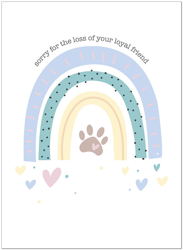 A pet sympathy card featuring a rainbow paw print design on matte FSC® paper.