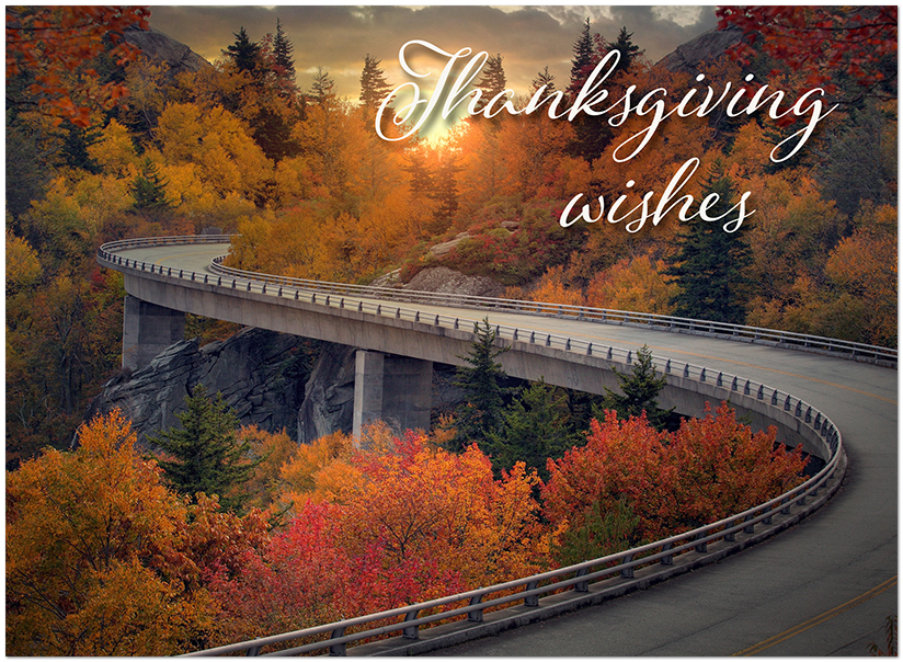 This Thanksgiving card features a glowing scenic drive. Printed on satin FSC® paper.