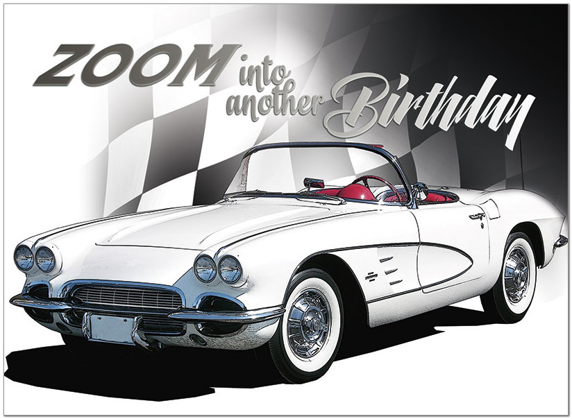A car-themed birthday card featuring a white 1961 Chevrolet Corvette. Printed on satin FSC® paper.